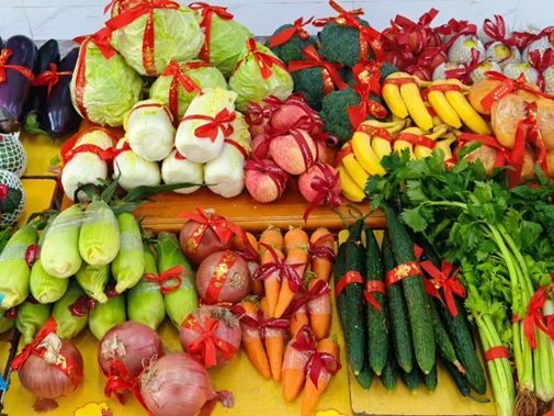 “这是‘紫气东来’的茄子,象征新的一年吉祥如意!”“包菜代表‘菜’华横溢,希望我们都能成为有才华的人!”礼盒内,紫莹莹的茄子、鲜灵灵的包菜、脆生生的芹菜、黄澄澄的香蕉等果蔬整齐摆放,每样都承载着精心设计的美好寓意。同学们捧着礼物满脸欢喜,小心翼翼解开红绸带,指尖轻拂新鲜果蔬,小声重复着老师讲解的寓意,眼神里满是珍视。