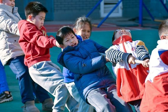 三至五年级的拔河比赛同样热烈。随着裁判哨响,麻绳瞬间绷紧,“大力士”们咬紧牙关、身体后倾,双脚牢牢钉住地面,红绸带在中线左右摇摆,胜负往往仅在毫厘之间。