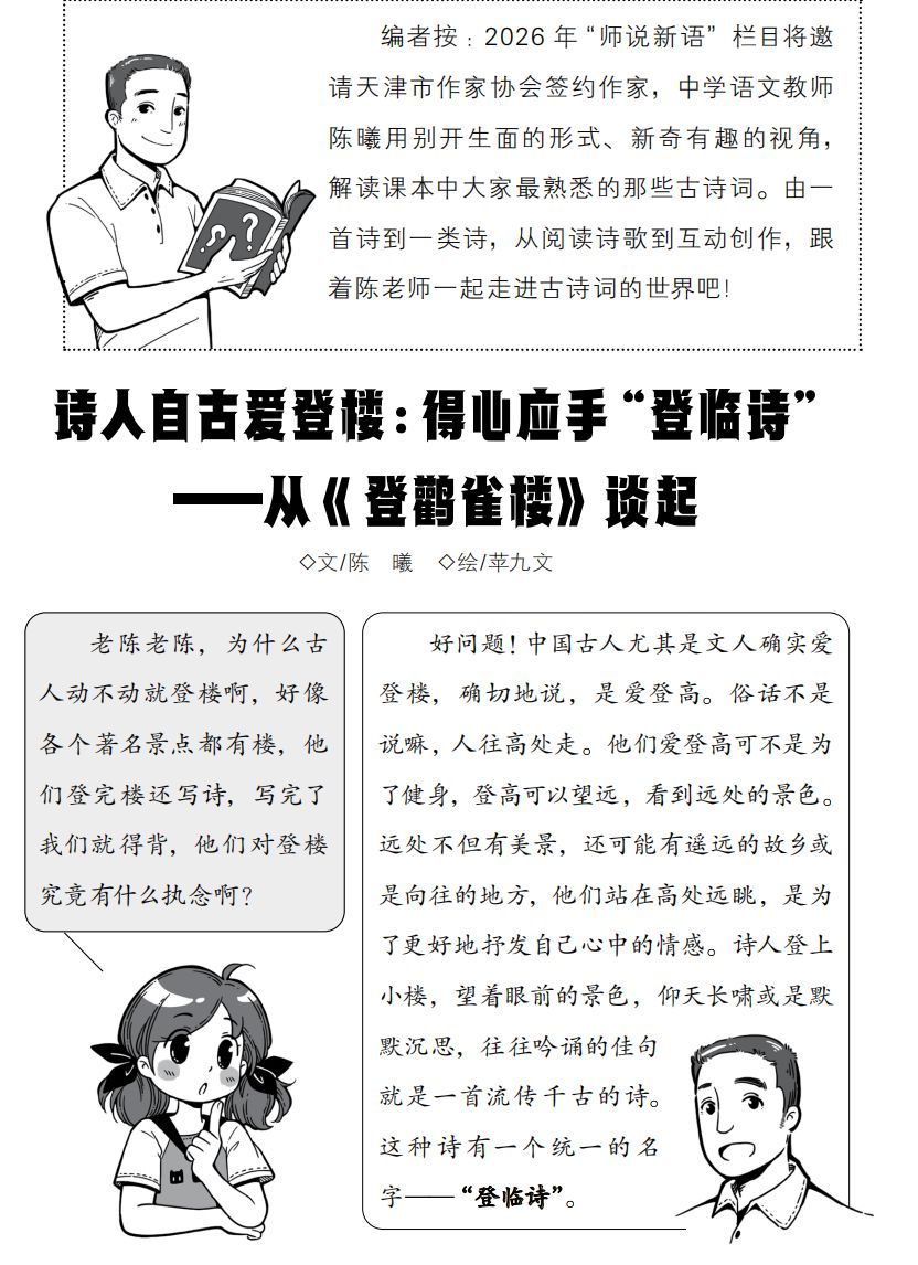 古人为何总爱登楼写诗?其实“登楼”是古人的抒情方式——登高望远,见天地辽阔,便忍不住抒发思乡、壮志或孤愁。本期陈老师以二年级课文《登鹳雀楼》为例,拆解读懂“登临诗”的三个要点:聚焦眼中所见的意象、由景及情体会情感、破解手法领悟思想。跟着老师再读《黄鹤楼》《登高》,你会发现每一首登临诗,都是诗人藏在山水间的真心。