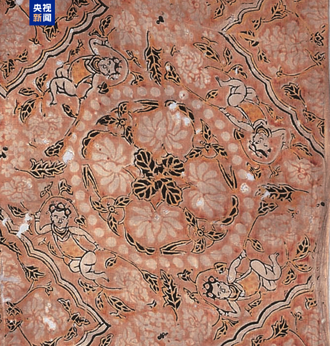 印婴戏莲纹绢以黑、橘红两种色彩为主