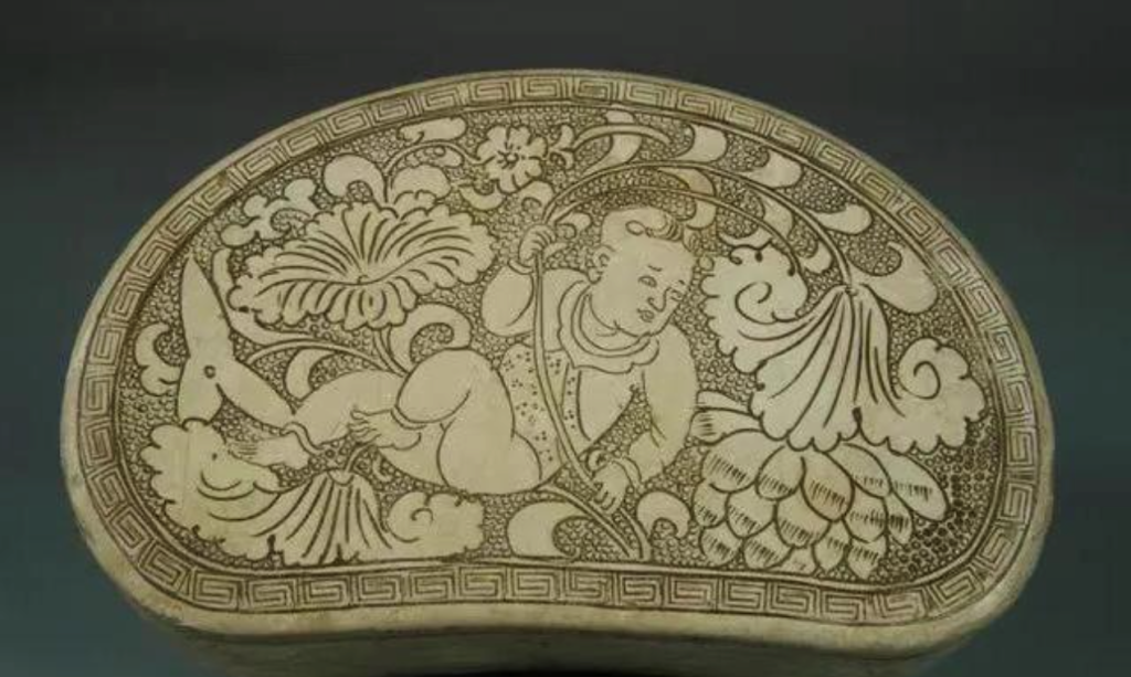 北宋白釉珍珠地娃娃卧莲瓷枕,开封市博物馆藏。其“婴戏图”纹样与印婴戏莲纹绢上的“婴戏图”纹样几乎一致
