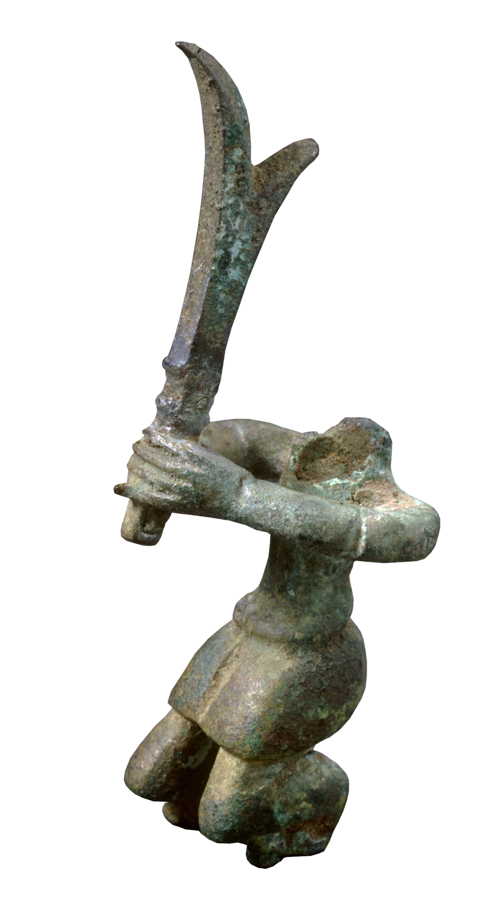 头戴平顶冠,佩铃形耳饰,身着无袖短裙