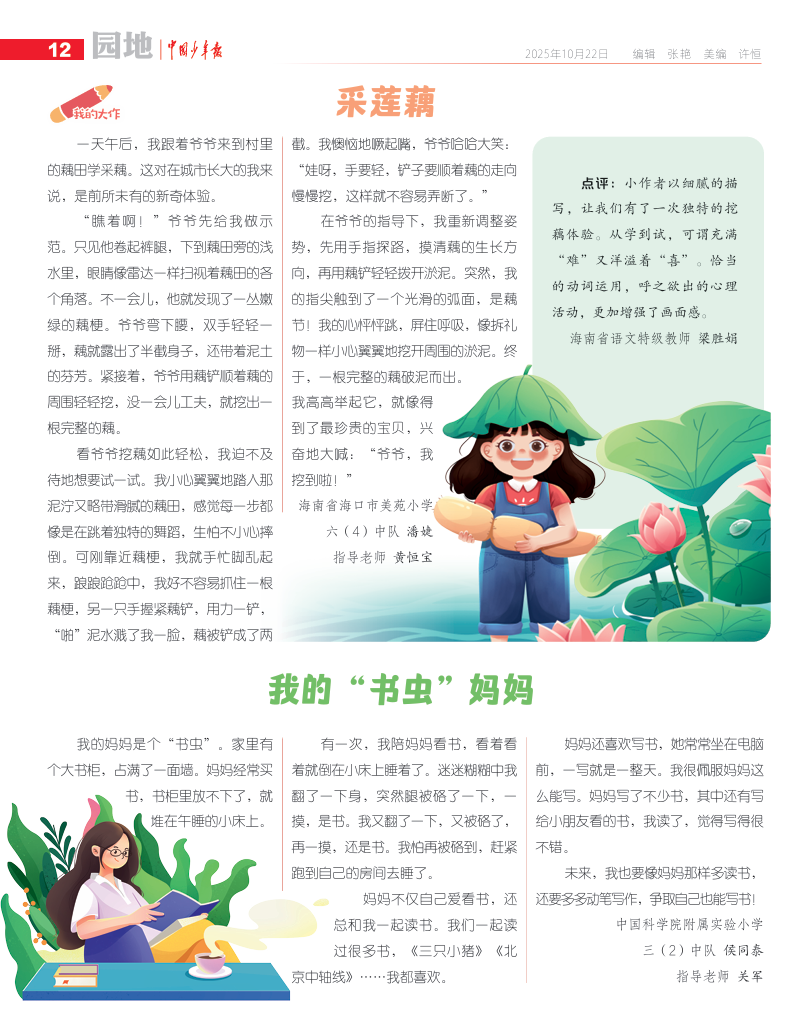 点评:小作者以细腻的描写,让我们有了一次独特的挖藕体验。从学到试,可谓充满“难”又洋溢着“喜”。恰当的动词运用,呼之欲出的心理活动,更加增强了画面感。
