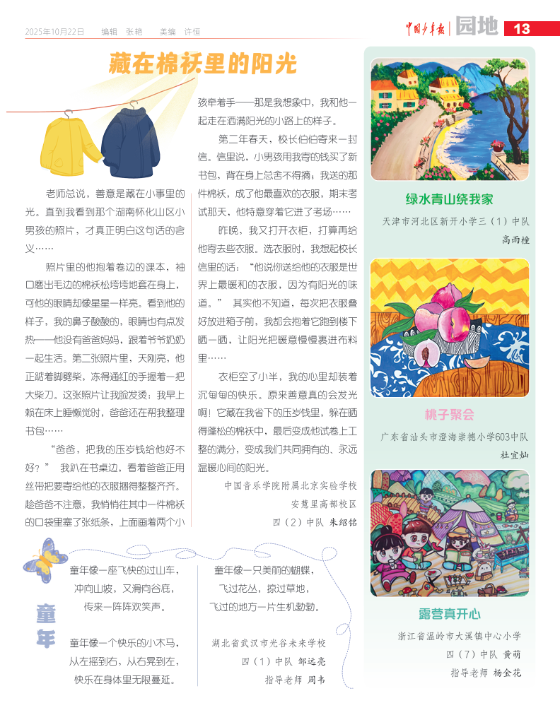 衣柜空了小半,我的心里却装着沉甸甸的快乐。原来善意真的会发光啊!它藏在我省下的压岁钱里,躲在晒得蓬松的棉袄中,最后变成他试卷上工整的满分,变成我们共同拥有的、永远温暖心间的阳光。