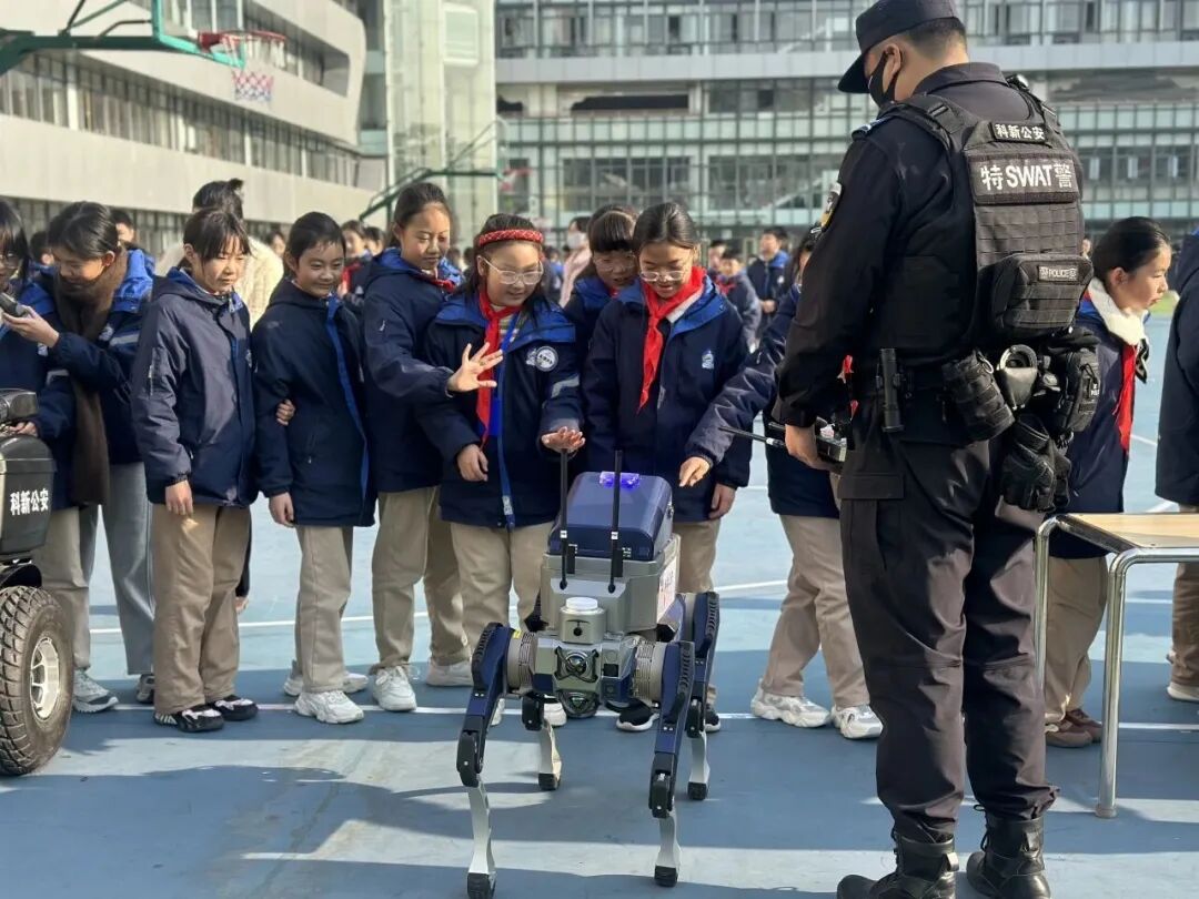 体验环节干货满满、精彩纷呈:走进警务工作现场,高清监控织就的“安全天网”,直观展现科技护民的强大实力;特警队员防暴处突演练动作迅猛、处置专业,无人机协同作业精准高效,尽显现代化警务的硬核力量与创新活力;“特警汪汪队”萌态十足又战力在线,成为队员们争相合影的焦点;特警装甲车、警用摩托车等装备近距离开放,亲手触摸厚重装甲、体验警用装备的瞬间,让队员们在新奇与崇拜中读懂“藏蓝铠甲”的使命重量。